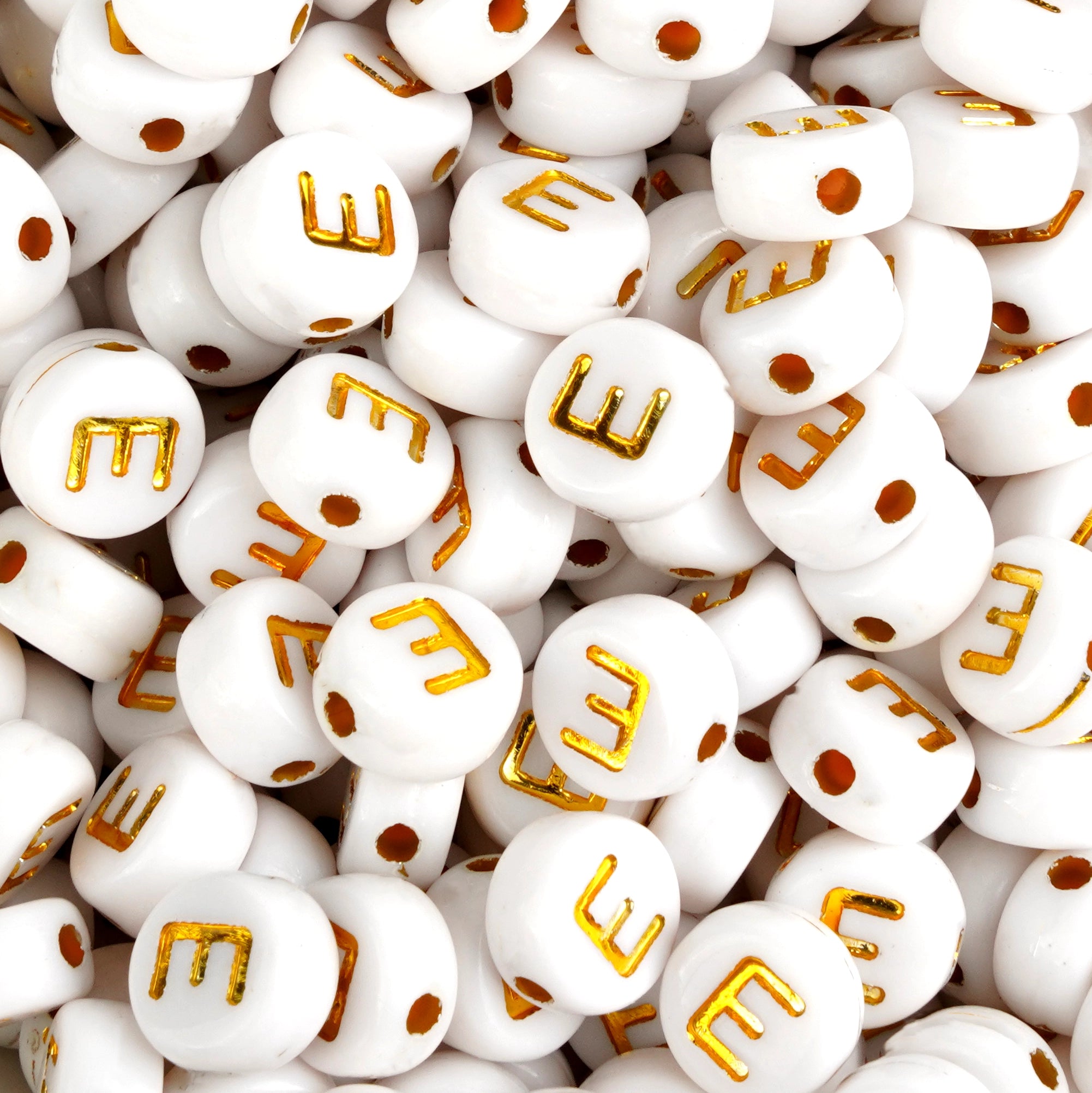 - Classic white beads accented with shiny gold lettering for a sophisticated look