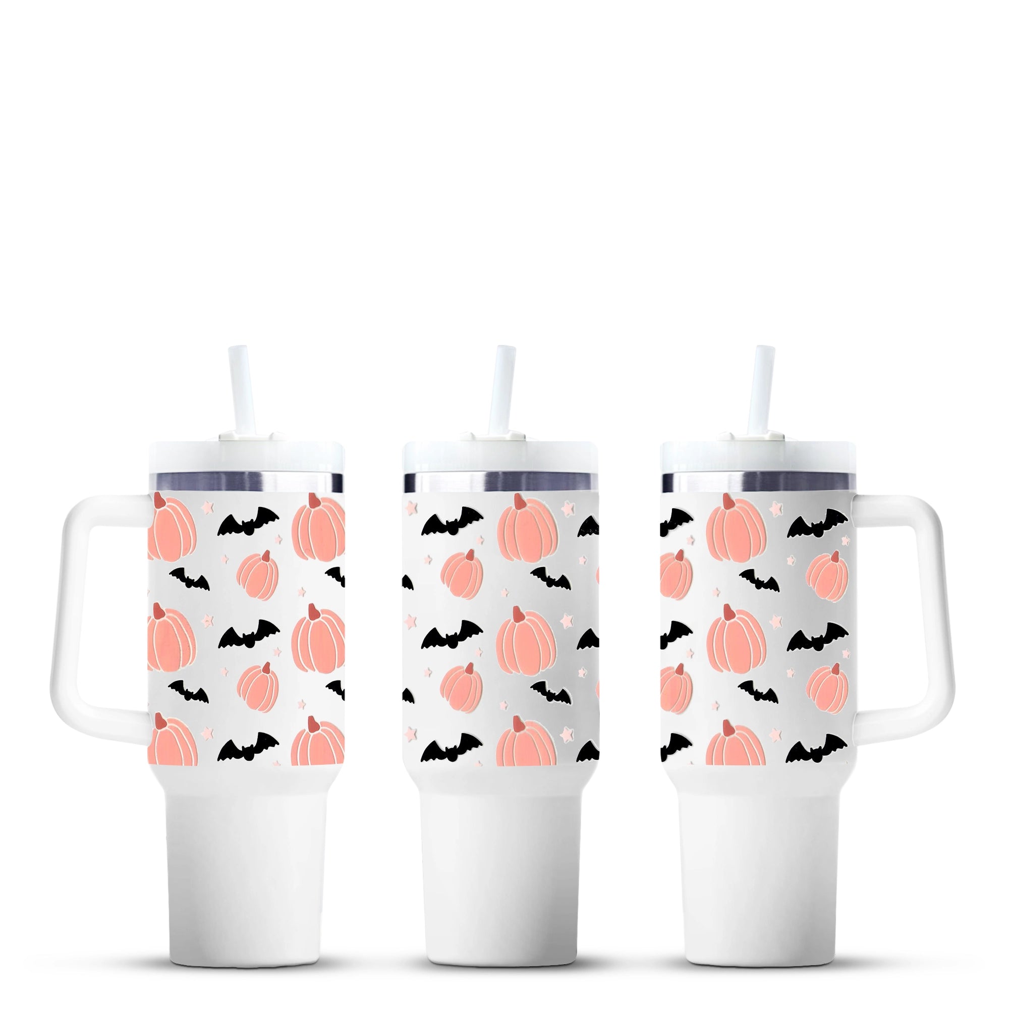 - Full-color UV DTF wrap with unique pink bats and pumpkins design